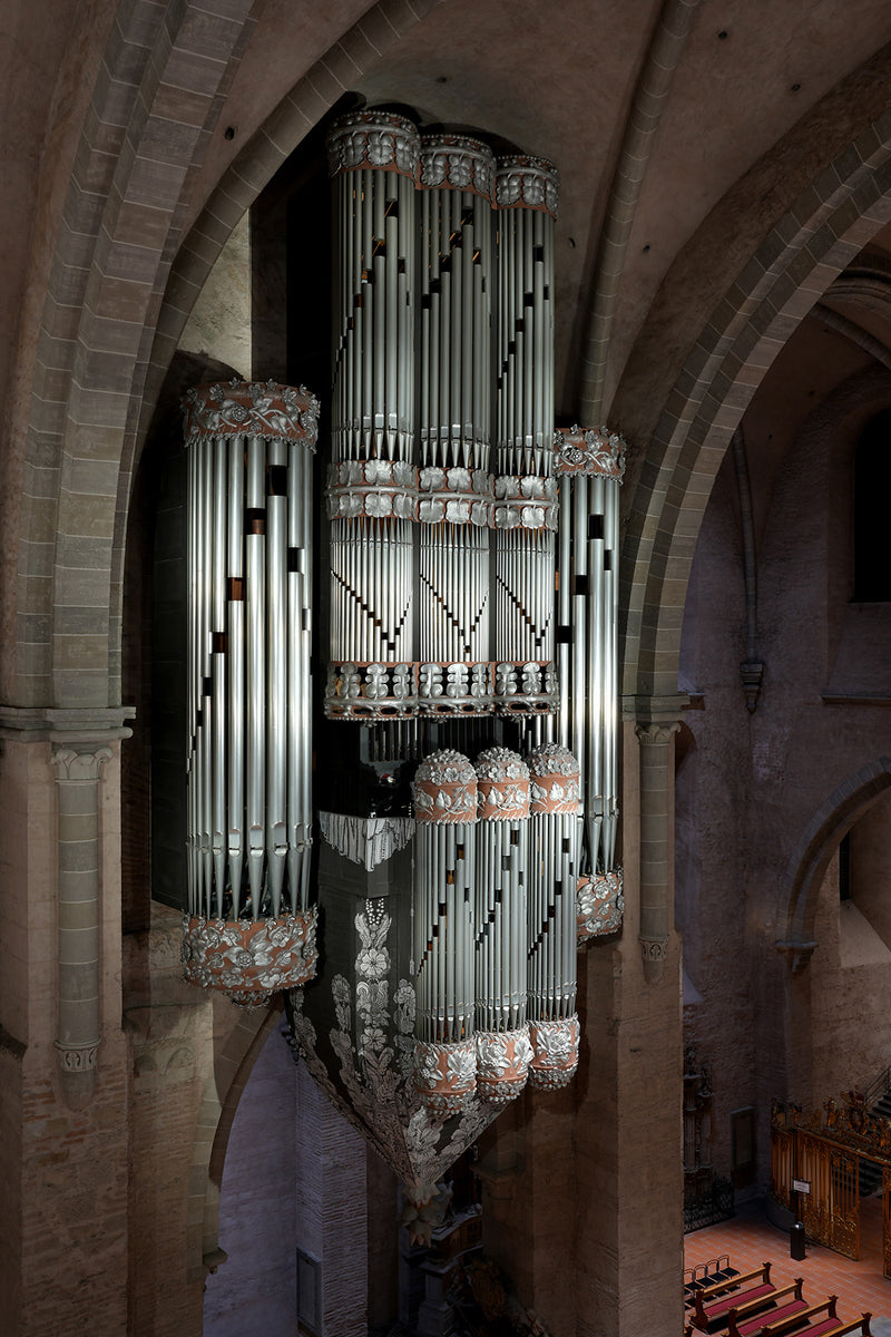Le poids de l'orgue à cinq étages n'est pas inférieur à 30 tonnes pour une hauteur de 16 mètres et une largeur de 8 mètres. La tradition baroque consistant à orner et à décorer richement les orgues est à nouveau mise en valeur dans la décoration plastique et colorée réalisée par les sculpteurs Hillebrand et Heiermann en collaboration avec le peintre Viktor Breiling.