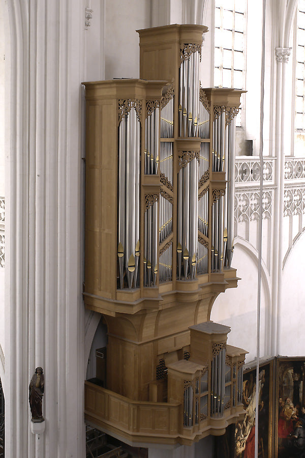 Grâce au soutien financier des entreprises Agfa-Gevaert NV et Bayer Antwerpen NV, la cathédrale d’Anvers a pu s’enrichir d’un deuxième orgue qui fut inauguré le 10 juin 1993 par Stanislas Deriemaeker, alors titulaire du grand orgue. Cet orgue de transept (III/45) fut réalisé par la société suisse Metzler. L’orgue Schyven se prêtant particulièrement bien à l’exécution d’œuvres romantiques et symphoniques des 19ème et 20ème siècle, le deuxième orgue devait principalement permettre l’interprétation de la musique baroque. Il fut opté pour une synthèse entre le style français et l’esthétique d’Allemagne centrale. La dénomination des registres (en français ou allemand) indique l’esthétique de chaque jeu. La Trompette 8’ du Grand-Orgue est par exemple suffisamment brillante pour être utilisée en solo dans la littérature baroque française ou pour fonctionner dans un Grand-Chœur, tandis que la sonorité de la Trompete 8’ (en allemand) de l’Oberwerk, plus ronde, convient davantage à la musique polyphonique grâce à son volume sonore également réparti sur l’ensemble du clavier.