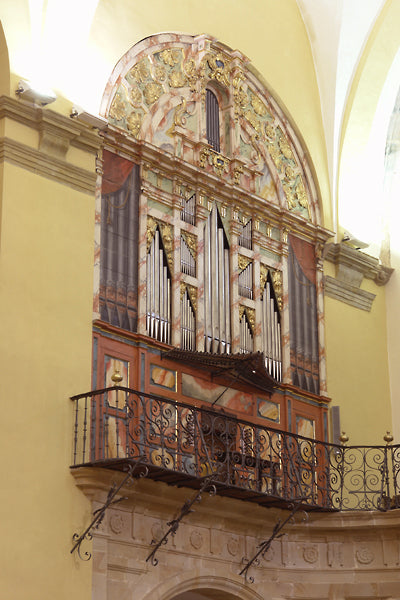 Dans les fonds du sommier l’inscription suivante a été trouvée: « Lorenzo de Arrazo vivant près d’Oñate avait travaillé sur cet orgue en l’année 1761. » Le buffet d’orgue a été construit par les maîtres Juan Antonio de Maíz et Joaquin Antonio Berasategui et réalisé selon les dessins du facteur d’orgues. L’orgue est situé dans un côté du choeur selon la tradition des orgues historiques de l’Espagne, du Portugal et de l’Amérique du Sud. En 1762, l’orgue a été réceptionné par le moine José de Larrañaga, expert d’orgues. Parmi ses 1450 tuyaux, seulement 51 sont simplement décoratifs. L’orgue a un clavier divisé en basses et dessus (45 notes, Do - do 5) avec octave courte, ainsi que huit touches de pédale diatoniques (Do - Si). Un total de 35 jeux est divisés en 15 basses « Bajos » (main gauche, Do 1 à do 3 ;) et 20 dessus « Tiples » (main droite, Do # 3 à Do 5 ), plus un ensemble de huit tuyaux de basse. Au dessus de la console en fenêtre on voit un impressionant ensemble de chamades (trompetería de batalla). En outre l’orgue a quelques effets spéciaux : rossignol, tambours et timbales. Il dispose également d’un jeux d’anche (Corneta) inclus dans une boîte expressive.