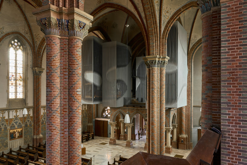 From the very beginning of the voicing in St. Anthony's Church, it became clear that, thanks to the chosen housing solution, the individual registers, both solo and in harmony, harmonized perfectly with the room acoustics, right up to a symphonic saturation of sound. The contemporary, pipe-less façade and the U-shaped arrangement of the pipes are reminiscent of the original location. Specially shaped and colored lamellae (medium-density fiber elements made of rice husks) for the front of the organ guide the sound of the organ perfectly into the nave. The neutral color scheme of the organ case blends discreetly into the sacred space with its reddish-brown brick interior.