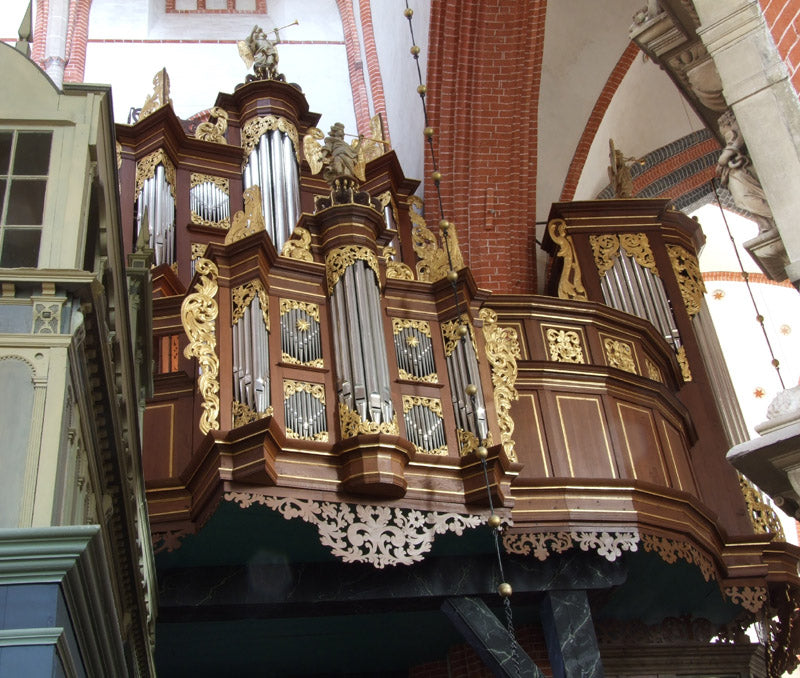 Eight of them were taken over from the two previous instruments: the oldest was from 1567 and built by Andreas de Mare from Groningen (Netherlands) / Emden (East Friesland), and the younger instrument by Edo Evers from Emden / Jever (East Friesland) in 1618. The 3110 pipes are distributed among five different divisions that are played from three manuals and the pedal. The instrument is located on the southeastern crossing pier, whereby the single large pedal tower is exceptionally placed in the transept. In 1981–85 the organ was restored in an exemplary manner by Jürgen Ahrend from Leer-Loga, at which time twenty-five stops and three of the six bellows were reconstructed after models by Schnitger.