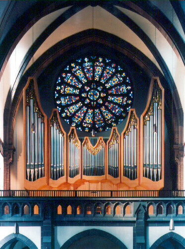 The tonally handsome instrument of the Church of the Holy Spirit in Mannheim, built in 1990, is the work of the organbuilder Karl Göckel from Mühlhausen-Rettigheim near Heidelberg. The organ has 44 stops on three 58-note manuals and a pedalboard of 32 notes. The note action is fully mechanical, while the third manual can be played via an auxiliary Barker lever with an automatic return assist. This Barker mechanism makes use of the exhaust principle and was patented by Karl Göckel (DE 4014204 Cl). Thus, it works by depressurization rather then by pressure as does the usual model, and functions with greater precision. The stop action is electric. There is a 64-stage combination action. The modern case in oak symbolizes in its shapes and ornamentation the tongues of fire of the Holy Spirit. The specification shows the influence of French organbuilding, particularly the Swell division which contains four reed stops. The reed pipes were custom made in the Göckel shop. A further unusual feature is the two divisions under expression. Outstandingly successful are the four overblowing flutes. Hence it may be asserted that this very beautiful, carefully voiced organ may be counted among the most successful organs to be credited to German organbuilding over the past years. It is highly appropriate to the performance of French organ music of our century.